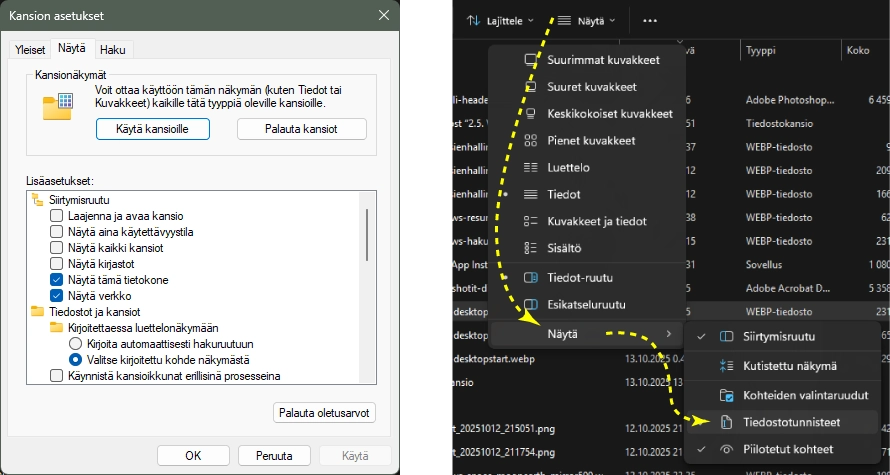 • Tiedostopäätteet kertovat mikä tiedostomuoto on kyseessä. Tuttuja tiedostomuotoja ovat esimerkiksi .jpg, .png, tai .docx. Tiedostomuodot voidaan asettaa näkyviin kaikissa tiedostoissa resurssienhallinnassa Näytä-painikkeen Näytä-toiminnosta, josta löytyy asetus Tiedostotunnisteet, jota klikkamalla ne tulevat näkyviin.