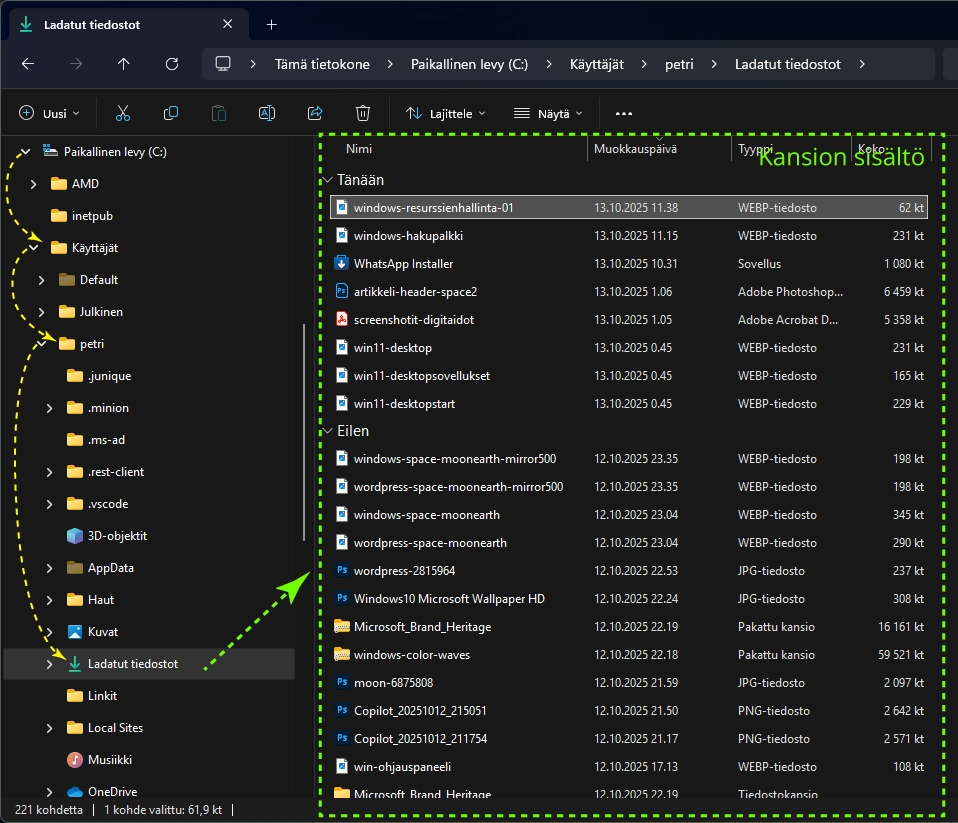 Ikkunan yläosassa näkyvä osoitepalkki kertoo, missä kansiossa juuri nyt ollaan. Esimerkiksi Tämä tietokone > Paikallinen levy (C:) > Ladatut tiedostot kertoo, että käyttäjä selaa C-aseman ”Ladatut tiedostot” -kansiota. Osoitepalkkia voi myös klikata ja muokata, jolloin voit siirtyä suoraan haluamaasi sijaintiin.