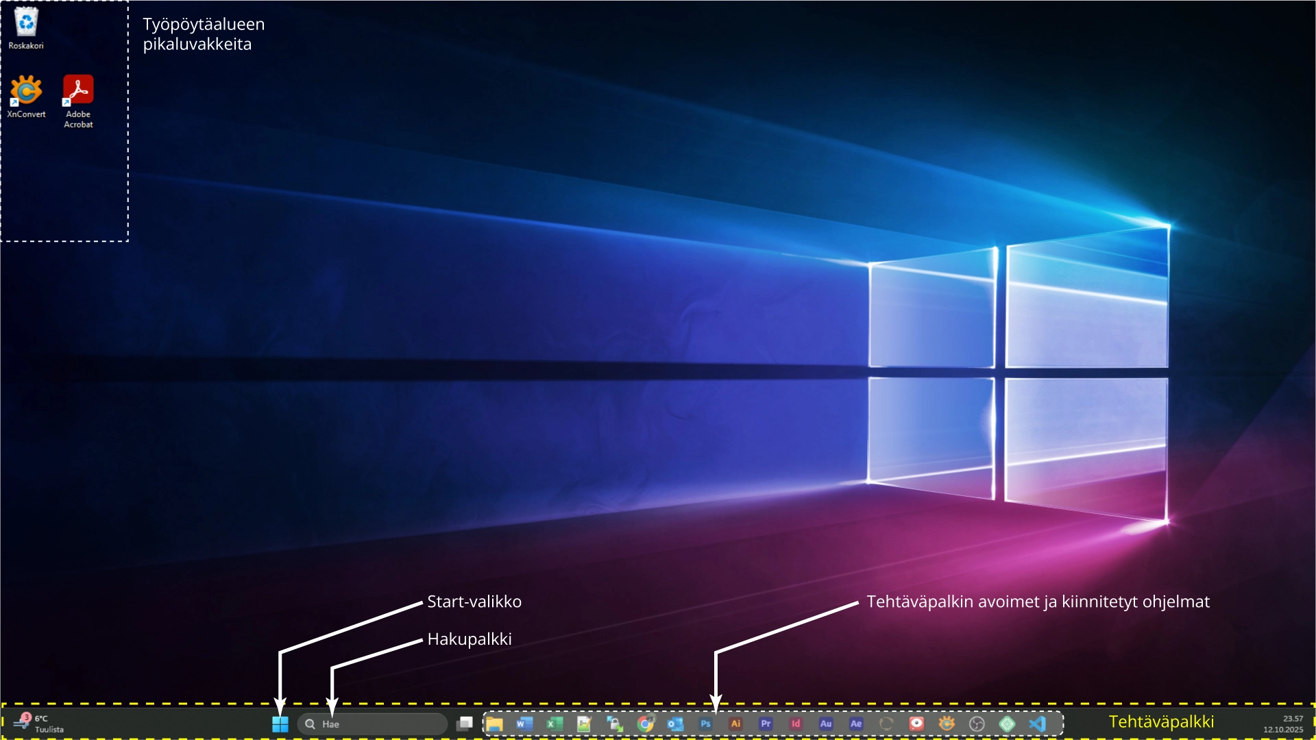 • Tehtäväpalkki, joka sijaitsee oletuksena näytön alareunassa ja sisältää Start-valikon, hakupalkin, avoimet ohjelmat ja järjestelmäkuvakkeet