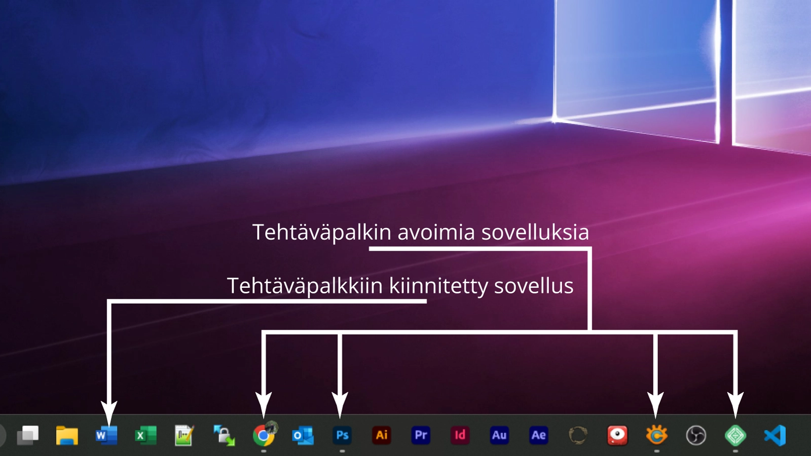 Voit siirtyä ohjelmasta toiseen napsauttamalla sen kuvaketta tehtäväpalkissa. Kiinnitettyjä sovelluksia voi lisätä vetämällä kuvakkeen tehtäväpalkkiin tai valitsemalla ”Kiinnitä tehtäväpalkkiin” ohjelman valikosta.