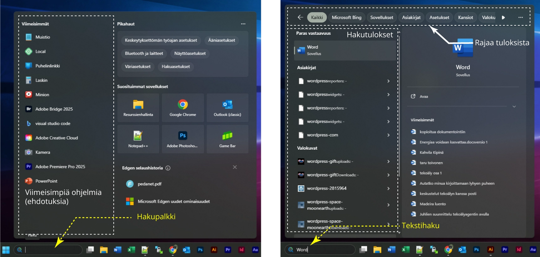 Hakupalkki sijaitsee tehtäväpalkissa ja toimii erittäin tehokkaana apuna ohjelmien, tiedostojen ja asetusten etsimisessä. Kun klikkaat hakupalkkia, avautuu näkymä, jossa on listattuna tavallisimmin käytettyjä sovelluksia. Jos alat kirjoittaa kenttään etsimäsi ohjelman tai toiminnon nimeä, hakunäkymään haetaan linkki etsimääsi ohjelmaan.