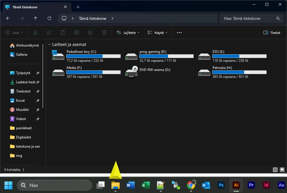 Oikeassa yläkulmassa oleva hakukenttä mahdollistaa tiedostojen etsimisen nykyisestä kansiosta tai koko asemalta. Kirjoita tiedoston nimi tai osa siitä, ja Windows näyttää osumat.