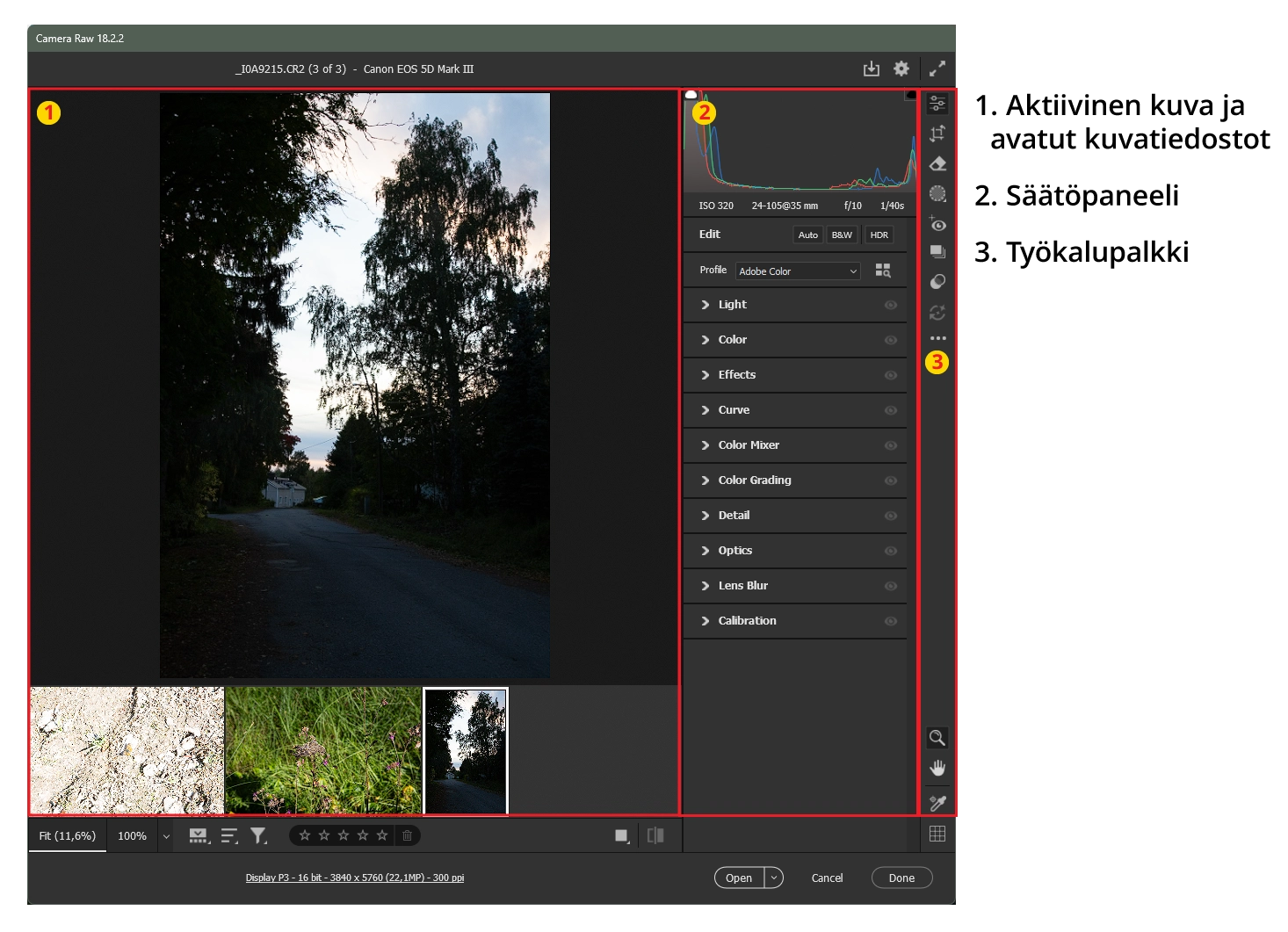 CameraRAW-ikkunan käyttöliittymä voidaan jakaa muutamaan elementtiin: