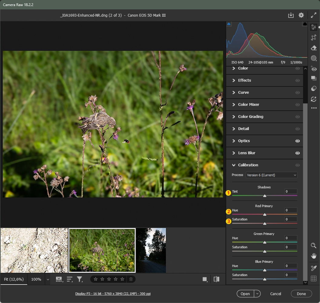 - Red, Green & Blue Primaries Hue: Kääntää päävärikanavan sävyä. Esimerkiksi sinisen kanavan säätäminen vaikuttaa kaikkiin väreihin, joissa on sinistä komponenttia.