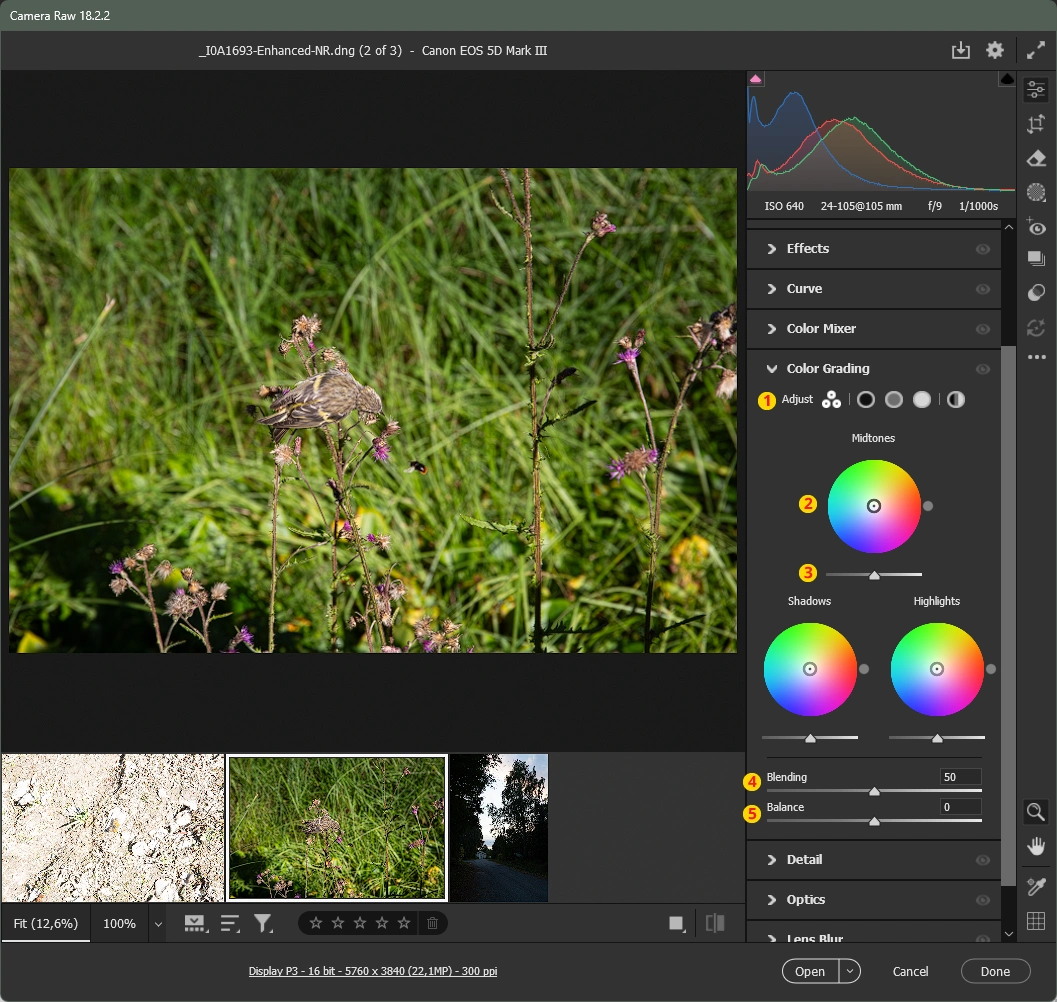 - Väriympyrä:Kaikissa valaistusasteissa (Midtones, Shadows, Highlights) on oma väriympyrä mistä valitaan valaistusasteen sävytys. Alueilla on säätöpiste, joka on aluksi ympyrän keskellä. Sitä voidaan liikutellaan alueilla ja kuvan kirkkausalueen sävytys muuttuu. Ympyrän reunalla on kierrettävä piste, jota siirtämällä kehällä voidaan vaihtaa sävyn väriä (Hue)