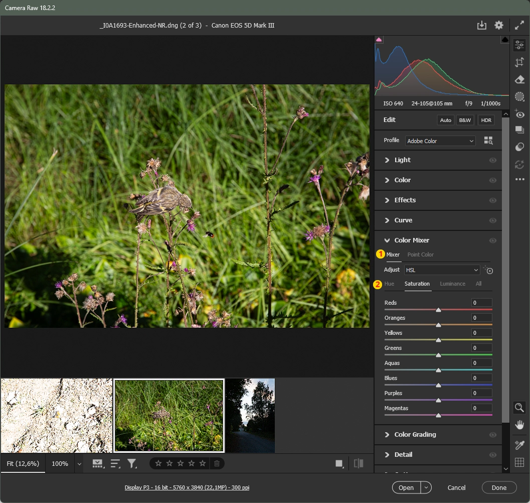 - Saturation (kylläisyys):Tällä säädetään valitun värin voimakkuutta. Voit esimerkiksi korostaa ruskan keltaisia sävyjä lisäämällä niiden kylläisyyttä tai vaimentaa häiritsevän kirkasta punaista elementtiä tekemällä siitä harmahtavamman.