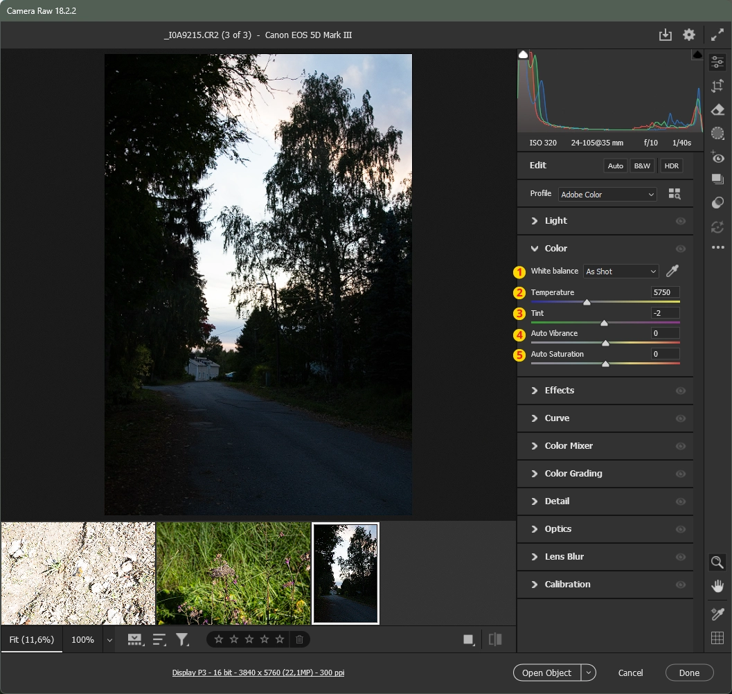 Erilaisia väreihin ja valkotasapainoon liittyviä perustoimintoja, joissa Vibrance ja Saturation säädöt ovat muuttuneet osittain tekoälypohjaisiksi. Näillä säätömahdollisuuksilla kuvasi värien perusparantamiset voidaan luoda todella helposti ja hyvin: