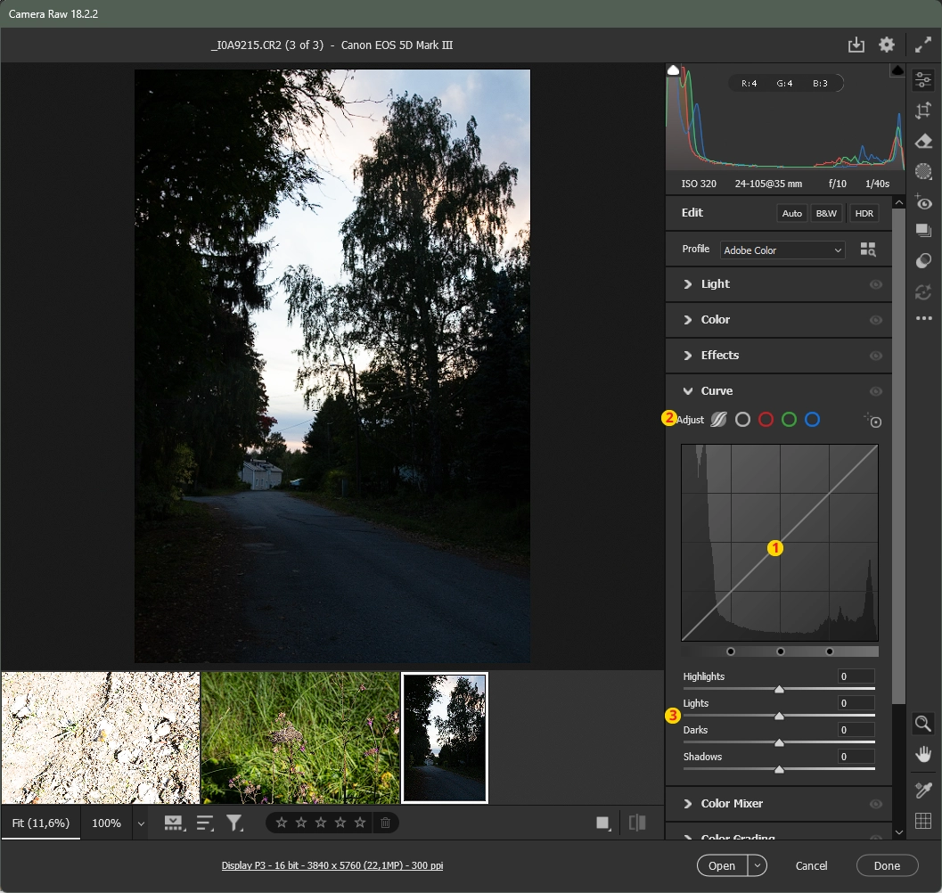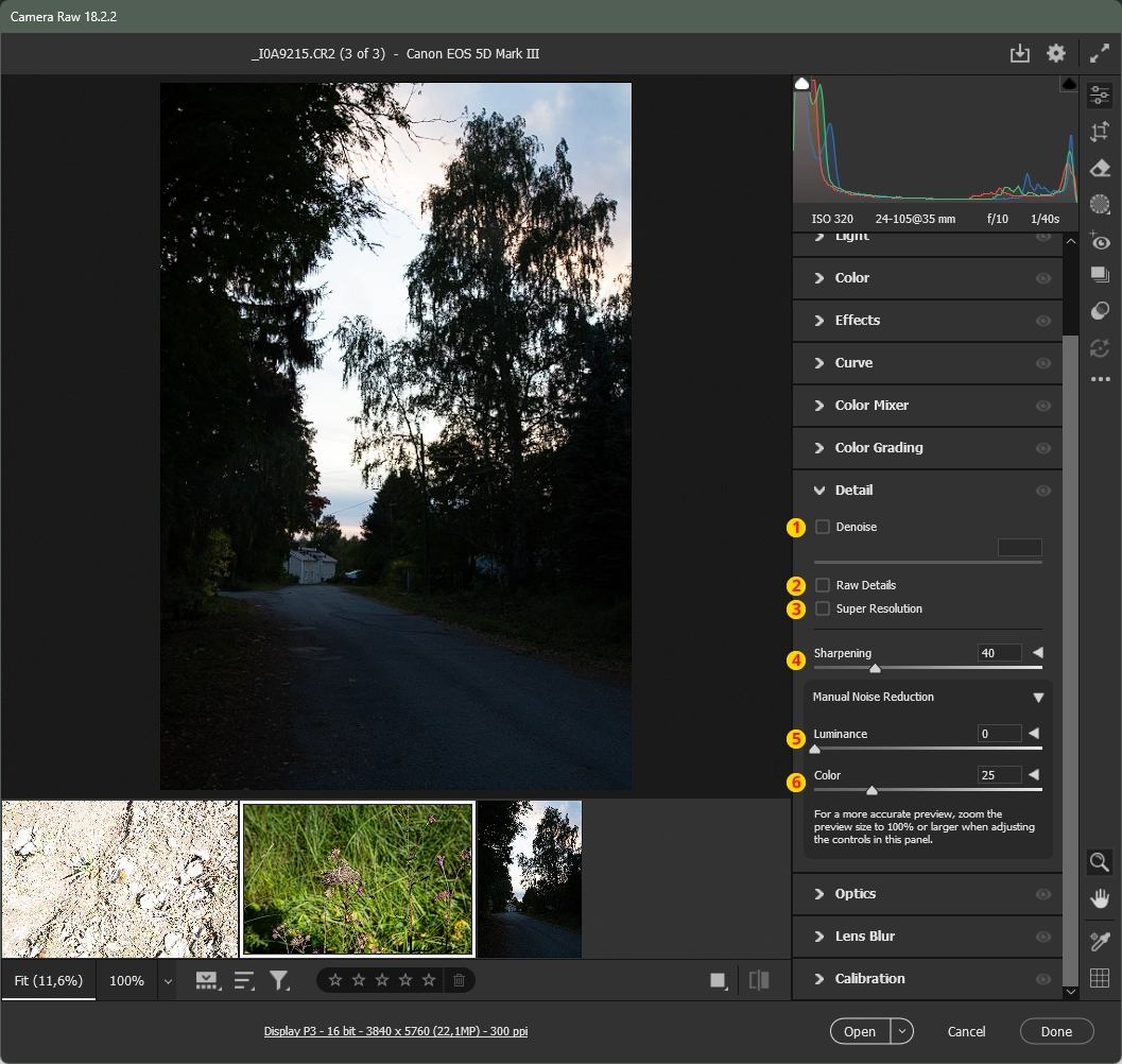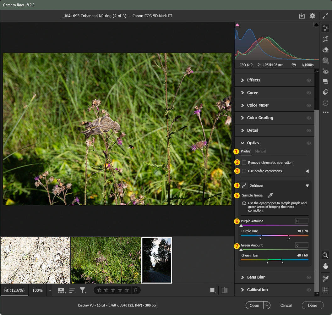 - Remove chromatic aberration: Poistaa tyypilliset vihreät ja purppuraiset ”haamureunat”, joita esiintyy usein kirkkaiden vastakohtien rajoilla (esim. puun oksat vaaleaa taivasta vasten).