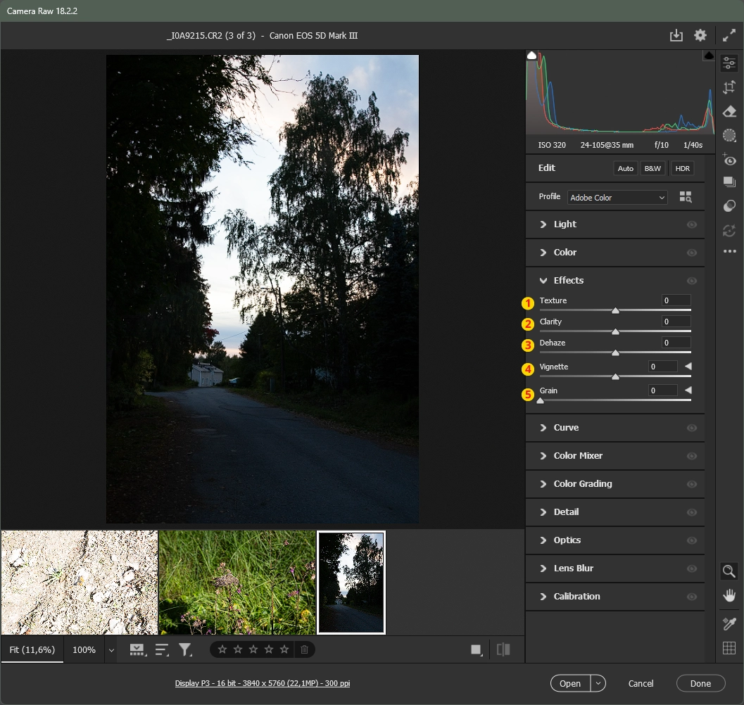 - Dehaze: Dehaze-säätimen avulla voidaan vähentää tai lisätä kuvan ”utuisuutta”.