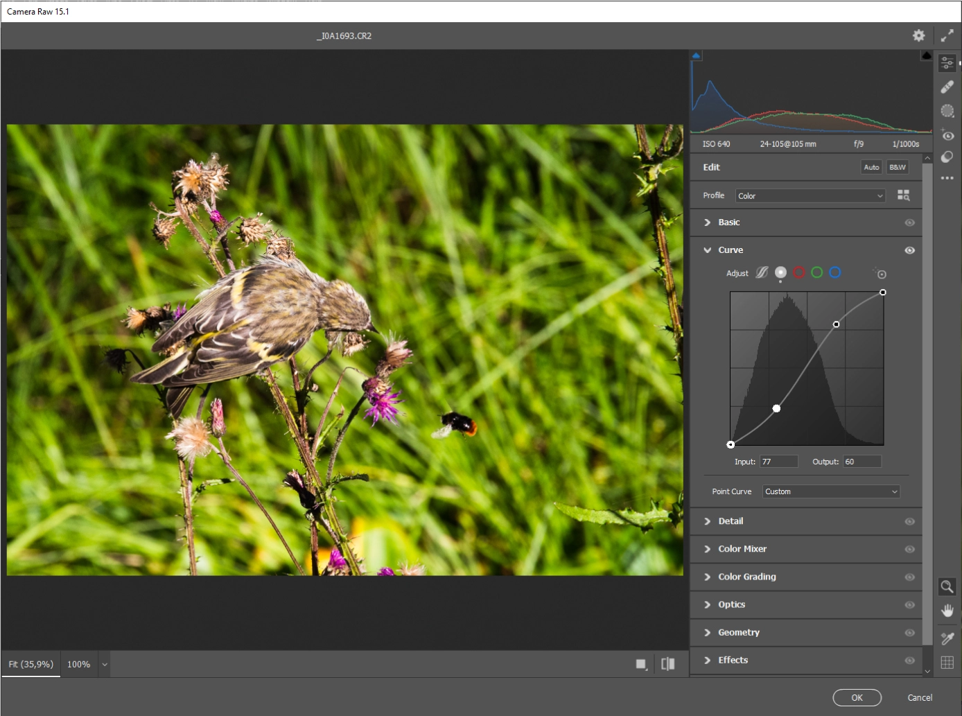 Kokeile parantaa keskimmäisen lintukuvan kontrastia lisäämällä siihen Curves-työkalulla ns. S-kurvi. Tartu janaan kirkkaiden pikselien alueella ja nosta ylöspäin, jolloin kirkkaat alueet kirkastuvat entisestään. Ota seuraavaksi kiinni pimeiden pikselien alueelta ja vedä janaa alaspäin, jolloin janasta tulee S-kirjaimen muotoinen. Tällaista asetusta kutsutaan S-kurviksi ja se on yksi tavallisimmista asetuksista kuvan kontrastin parantamiseksi.