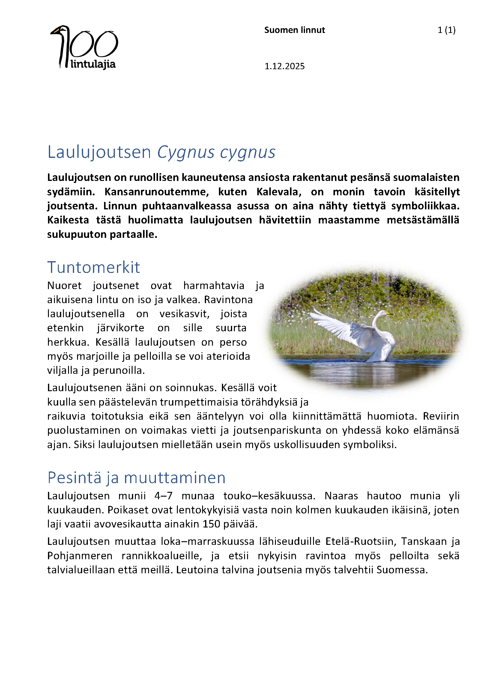 Suomen linnut ja laulujoutsen harjoitus