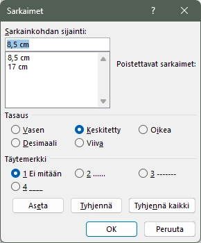 Poista kaikki olemassa olevat sarkaimet klikkaamalla Tyhjennä kaikki -painiketta. Sarkaimia asetetaan siten, että kirjoitetaan aluksi sarkaimen kohta senttimetreinä (cm), valitaan Tasaus ja mahdollisesti täytemerkkejä. Kun painetaan Aseta-painiketta sarkain tallentuu tyyliin ja voidaan kirjoittaa seuraava sarkain ja sen asetukset.