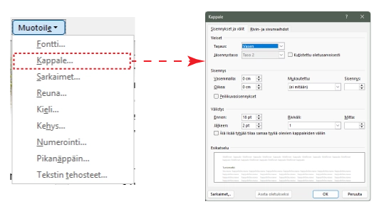 1. Kappale: Myyta tyylin välistys -asetusta. Aseta arvoiksi Yleiset/Tasaus vasen, Välistys/Ennen 18pt ja Jälkeen 2pt, Riviväli 1