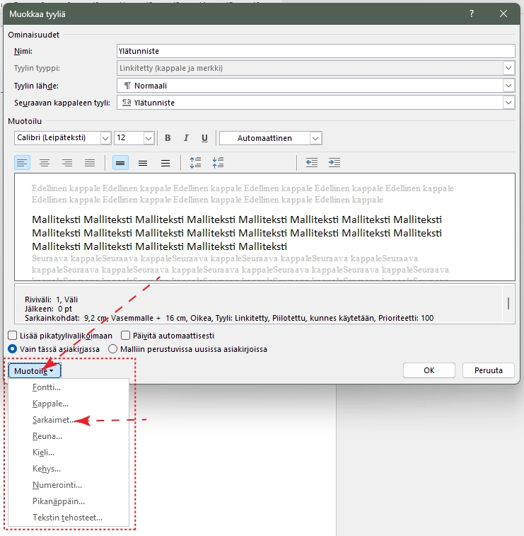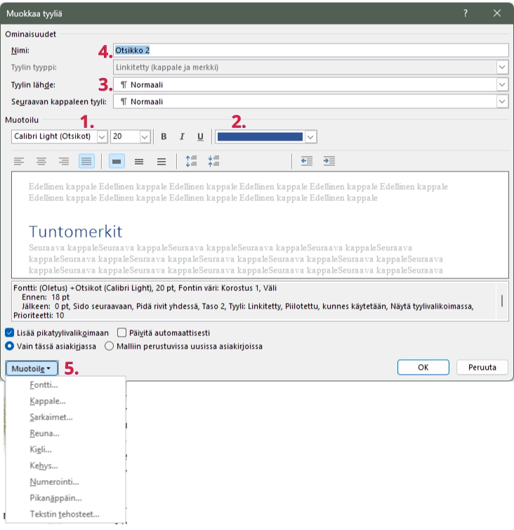 5. Muotoile: Muotoile-painiketta klikkaamalla avautuu valikko, josta voidaan asettaa lukuisia muita asetuksia tyylille. Siirrytään seuraavaksi tutkimaan Muotoile-asetuksia.