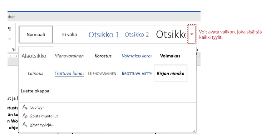 Wordin tyylitlohkon voi avata myös kokonaan, jotta kaikki toiminnot näkyvät.