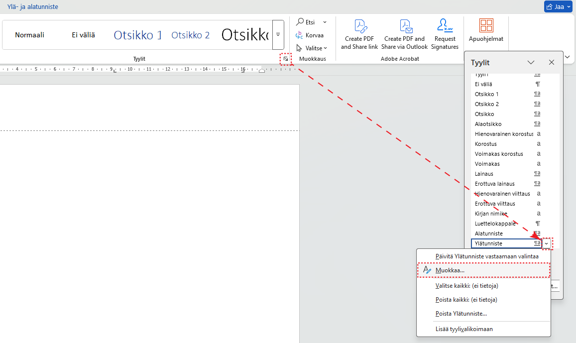 Tyylien asetuksia ja tekstien muotoiluja voidaan asettaa tyyliin periaatteessa kahdella tavalla. Voit siirtyä suoraan tyylin muokkausvalikoon klikkaamalla tyylin päällä -painikkeella ja klikata avautuvasta valikosta Muokkaa, joka avaa tyylin muokkausikkunan. Toinen tapa on muotoilla, jokin otsikko valmiiksi Aloitus-välilehden lohkoista Fontti ja Kappale. Kun otsikko näyttää omaan silmään hyvältä, voit klikata haluamaasi tyyliä -painikkeella ja valita avautuvasta valikosta Päivitä … vastaamaan valintaa, joka tallentaa maalatun tekstin muotoilun valittuun tyyliin.