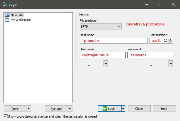 Lataa ja asenna WinSCP-ohjelma koneellesi ja avaa ohjelma. Ota esiin webhotellipalvelusta saamasi kirjautumistunnukset esiin.