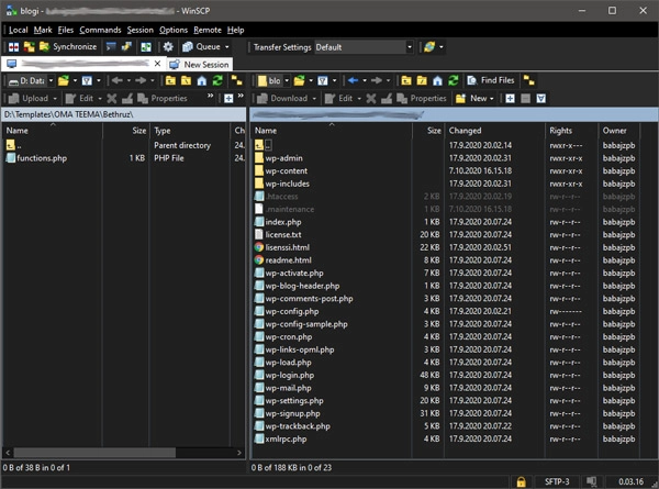 WordPressin tiedostot palvelimella WinSCP.