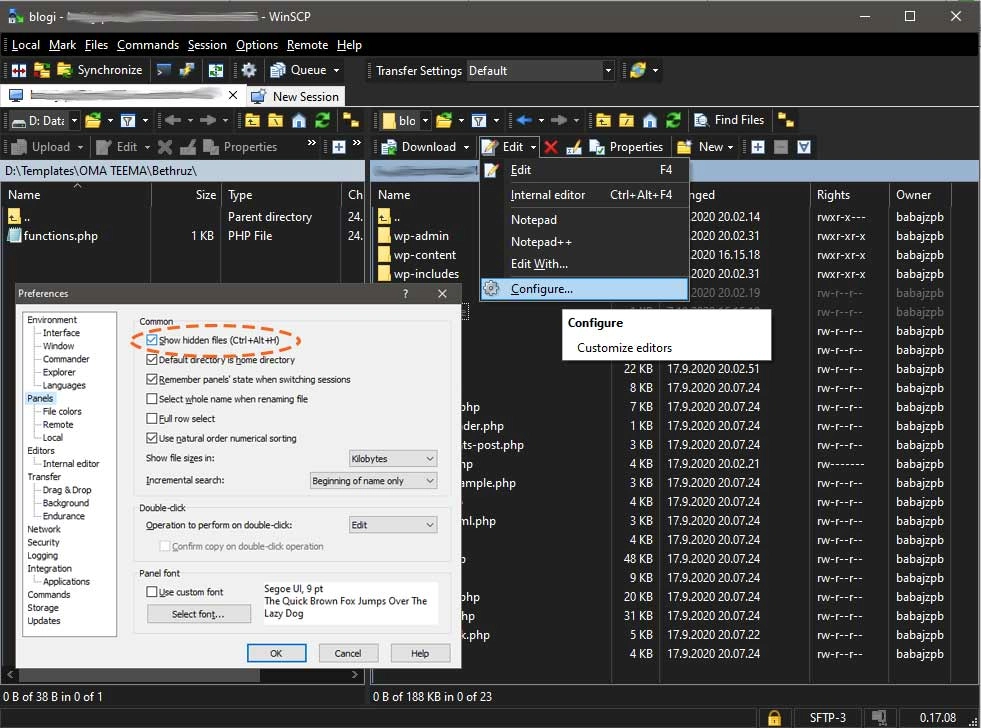 Olet oikeassa paikassa, jos kansiot wp-admin, wp-content ja wp-include ovat näkyvissä. Tiedostolistassa pitäisi nyt näkyä tiedosto nimeltä .maintainance. Jos tiedostoa ei ole näkyvissä, avaa ohjelman asetuksista (Edit/Configure…) Panels -välilehdestä Show hidden files ja aktivoi se. Paina ok ja tiedosto tulee näkyviin.