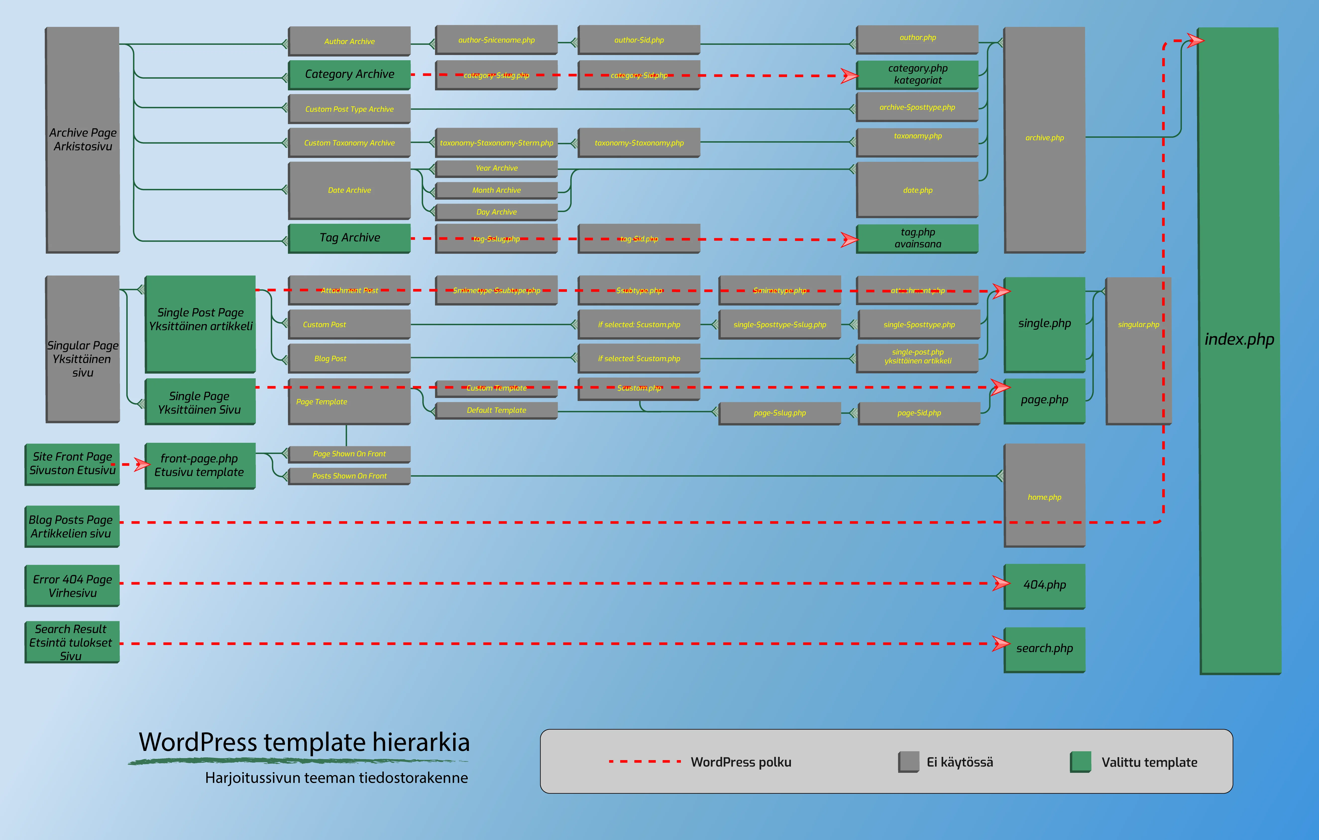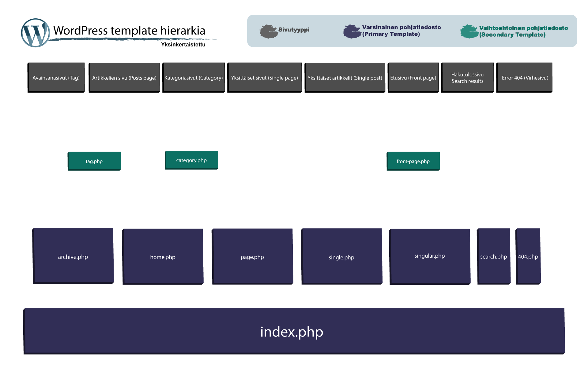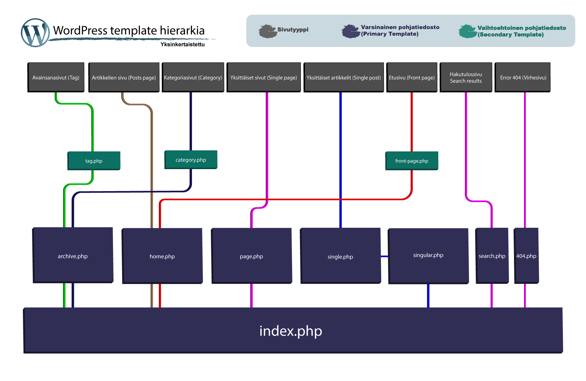 Edellisessä artikkelissa käsittelimme luettelomaisesti erilaisia WordPress-teematiedostoja, joista useat kuten index.php, page.php tai single.php ovat luonteeltaan template-tiedostoja. Template on siis käytännössä PHP-tiedosto, joka määrittää, miltä jokin tietty sivutyyppi näyttää WordPress‑sivustolla. Esimerkiksi yksittäiselle artikkelille (single.php), sivulle (page.php) ja etusivulle (front-page.php) on omat template‑tiedostonsa WordPressin tiedostorakenteessa. Template‑hierarkia puolestaan kuvaa sen, missä järjestyksessä WordPress etsii ja valitsee käytettävän template‑tiedoston, kun se renderöi sivua. Katsotaan hieman edilaisia Template-tiedostoja ja mitä tiedostoja WordPress-teema vähimmillään tarvitsee toimiakseen.