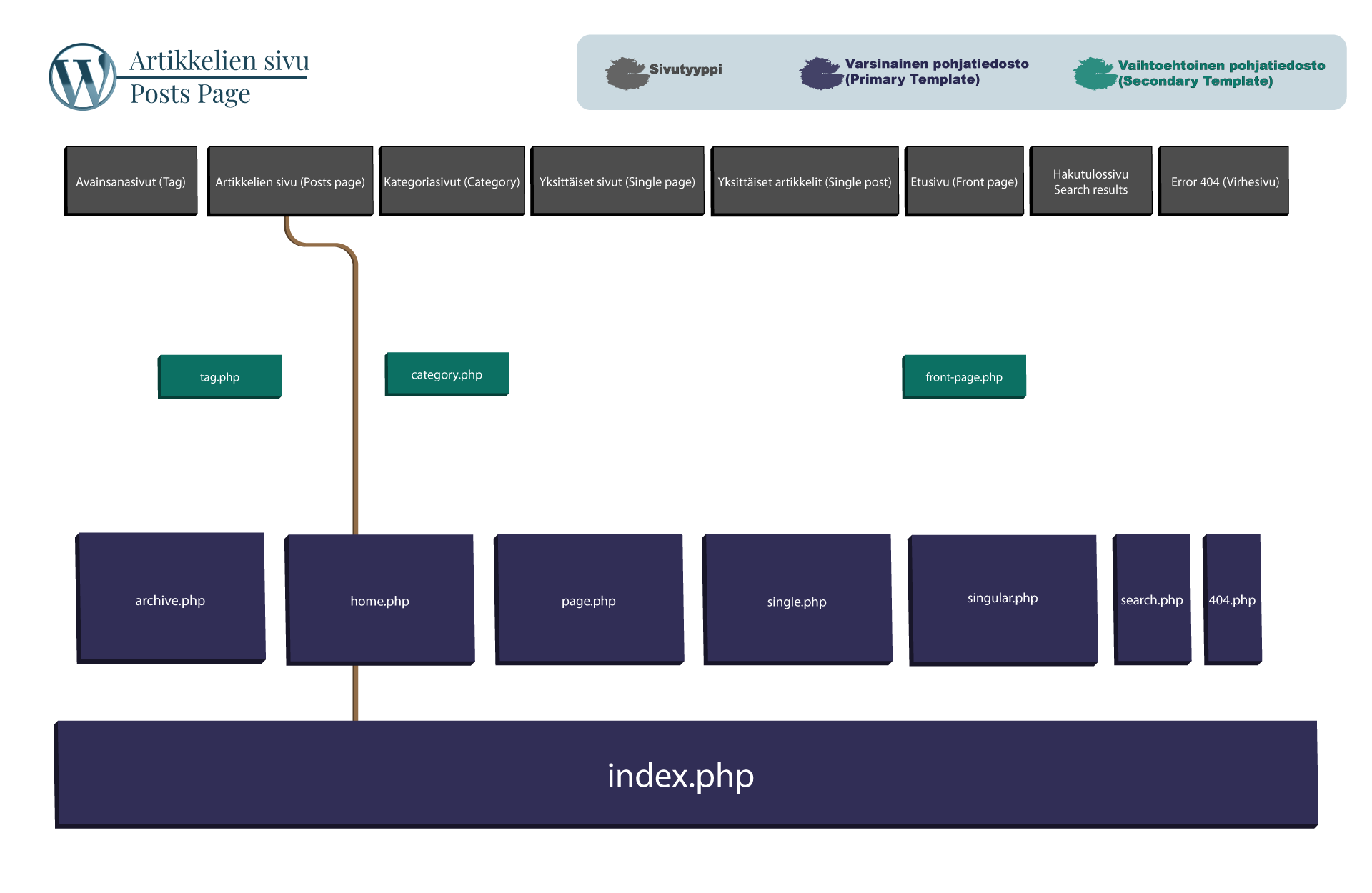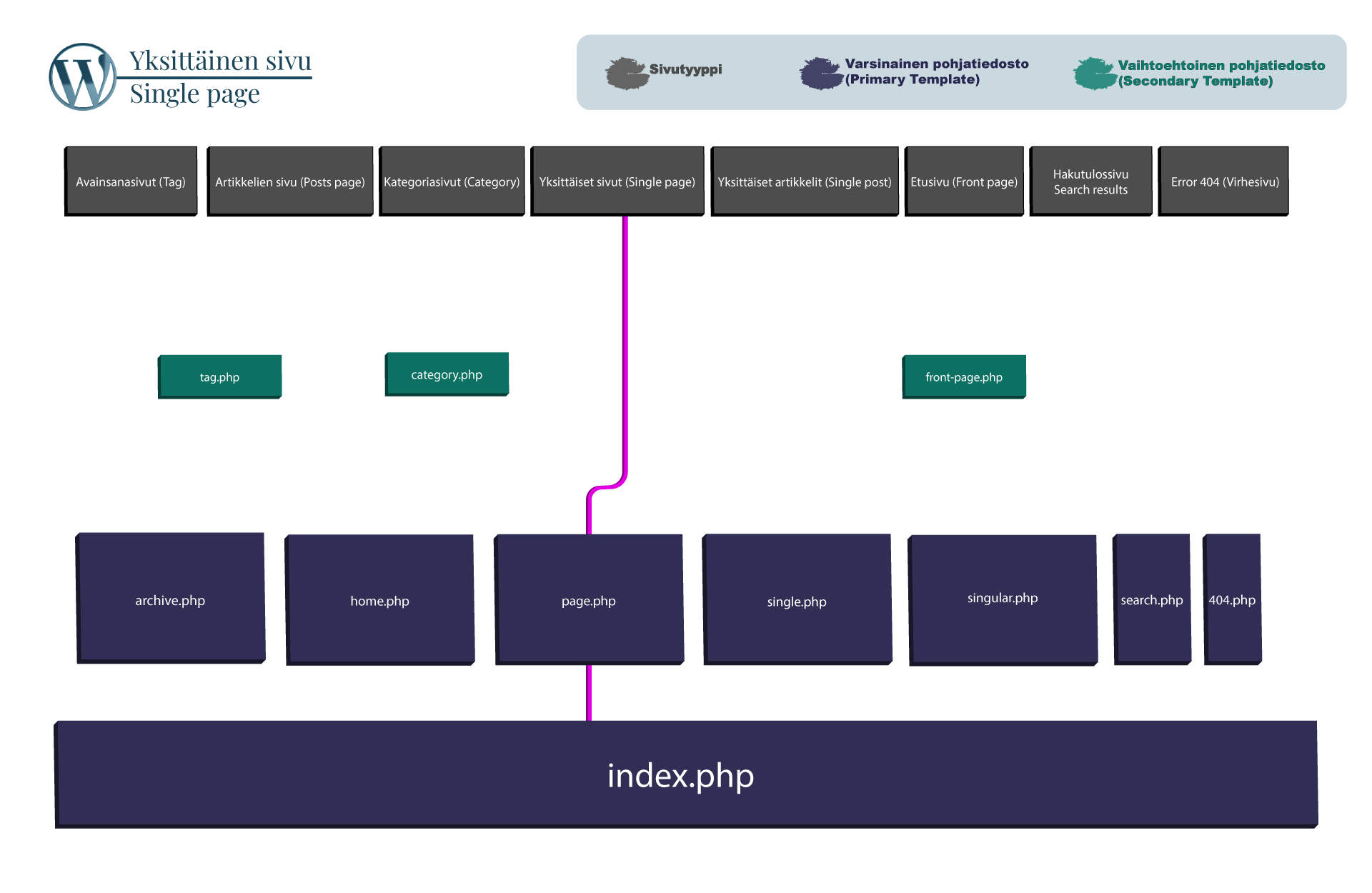 - page.php – Jos etusivuna on staattinen sivu asetettu etusivuksi, WordPress etsii home.php tiedoston sijaan tätä tiedostoa.